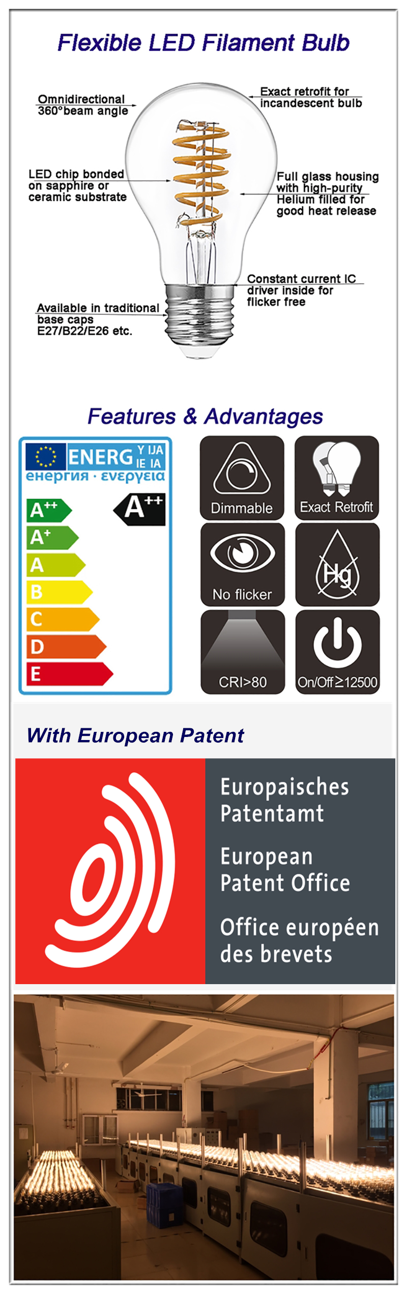 Ampoule à filament flexible INNOLITE LED (Ampoules de filament de LED avec la base de la lampe E26 E27 B22) GLS A67 avec brevet de filament européen fournissent un grand style rétro avec le style classique familier que vous connaissez et aimez. Avec le brevet européen de filament souple, cela signifie que vous pouvez vendre cet article sur le marché européen sans aucun problème de brevet.