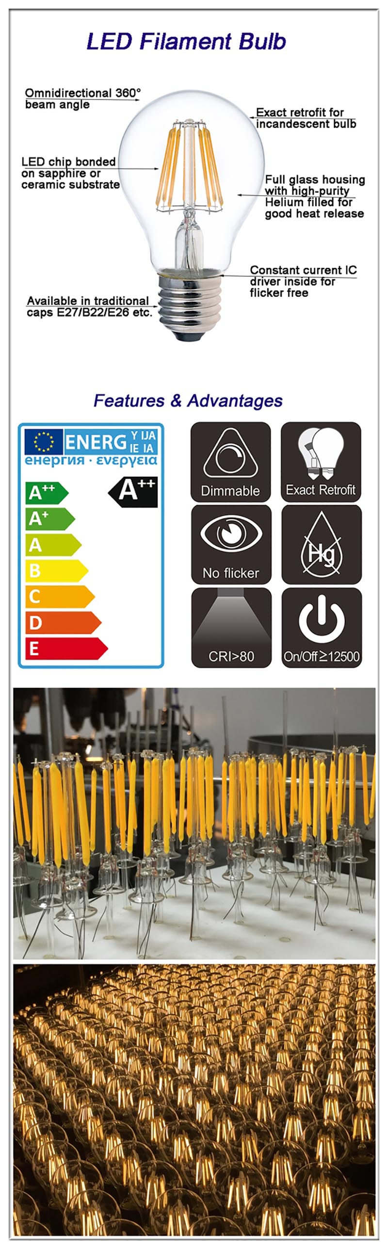 PodanieŻarówka LED żarowa GLS A19 A60 8W (odpowiednik żarówki LED o mocy 75 W) zapewnia doskonałe dekoracyjne oświetlenie do jadalni, sali konferencyjnej, salonu, salonu wystawowego, hotelu, sklepu, bistro, korytarza, budki telefonicznej, studia i wystawy itp. idealnie nadaje się do użytku w pomieszczeniach w bistro, dużych namiotach, dekoracyjnych lampach ślubnych, dekoracyjnych pasmach świetlnych, komercyjnych strunach świetlnych, żyrandolach, ozdobnych oprawach itp.
